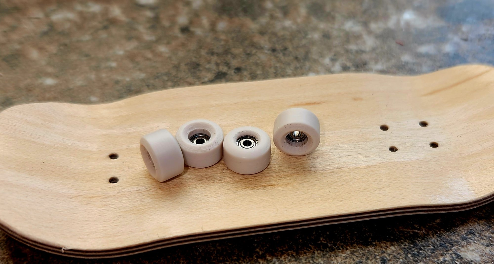The material I am using is something I believe to be completely unique in fingerboarding. I am using completely recycled material to mold these and this material has no shore hardness rating. All I can say from my years of fingerboarding is that they are comparable to a 75D. The grip is perfect, the squeak is realistic, and the shape is amazing. I am using ABEC 7 bearings but honestly the ABEC 5 I tested almost felt better but you know...higher numbers have to be better right?